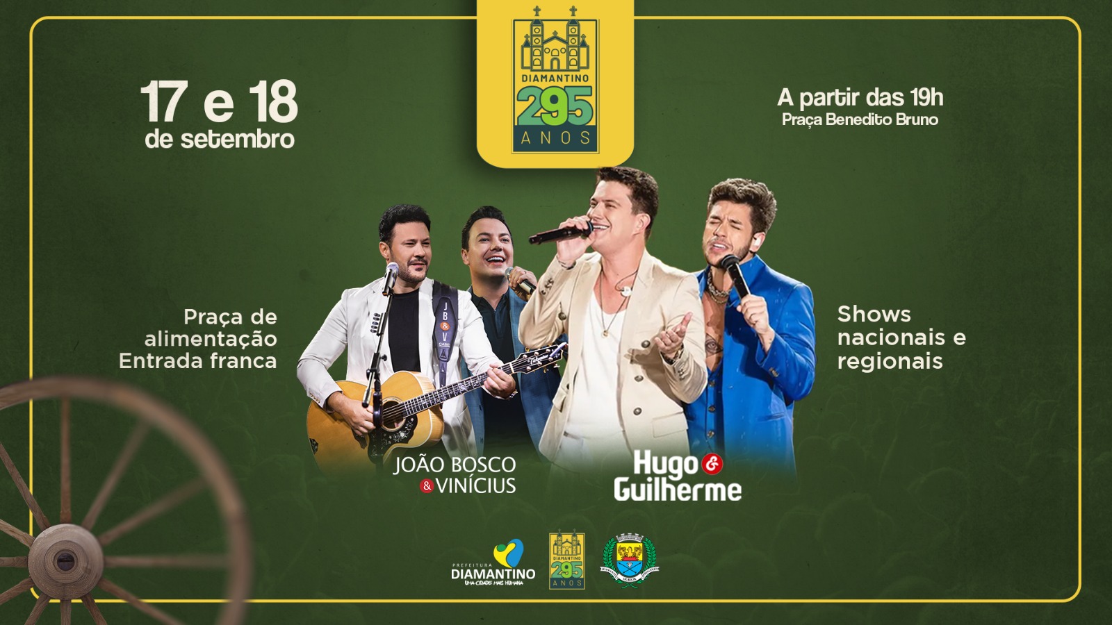 A Prefeitura de Diamantino, por meio da Secretaria Municipal de Cultura e Turismo, confirmou os shows nacionais das duplas Hugo e Guilherme e João Bosco e Vinicius na comemoração dos 295 anos do município de Diamantino, que acontecerá na praça Benedito Bruno, em frente a Prefeitura. No dia 17, João Bosco e Vinícius será a atração principal do evento, a partir das 23 horas. Já na segunda (18.09), também a partir das 23 horas, é a vez da dupla sertaneja Hugo e Guilherme comandar o palco.