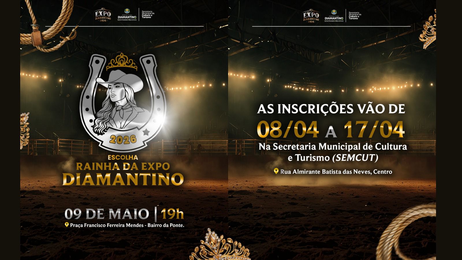 A Prefeitura de Diamantino, por meio da Secretaria Municipal de Cultura e Turismo, está com inscrições abertas para o tradicional concurso de Escolha da Rainha da ExpoDiamantino 2026, evento que marca a abertura oficial da programação da maior feira do município.