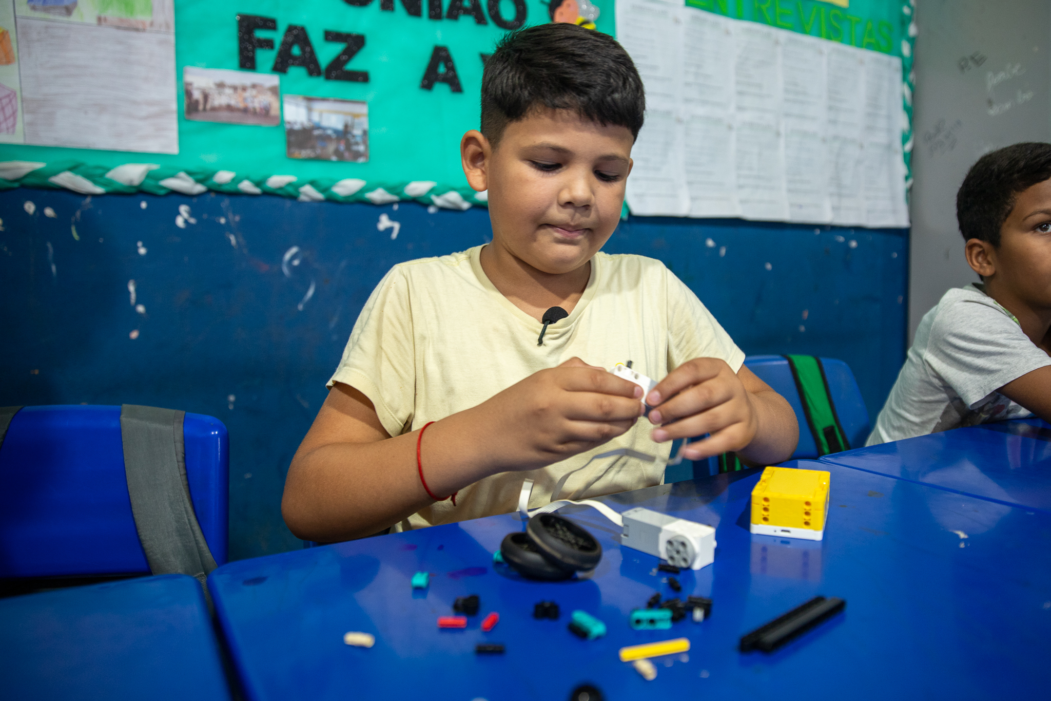O aluno do 4º ano, Yuri José, de 10 anos, explicou com euforia como foi o processo de montar seu 1° robô durante a aula.
