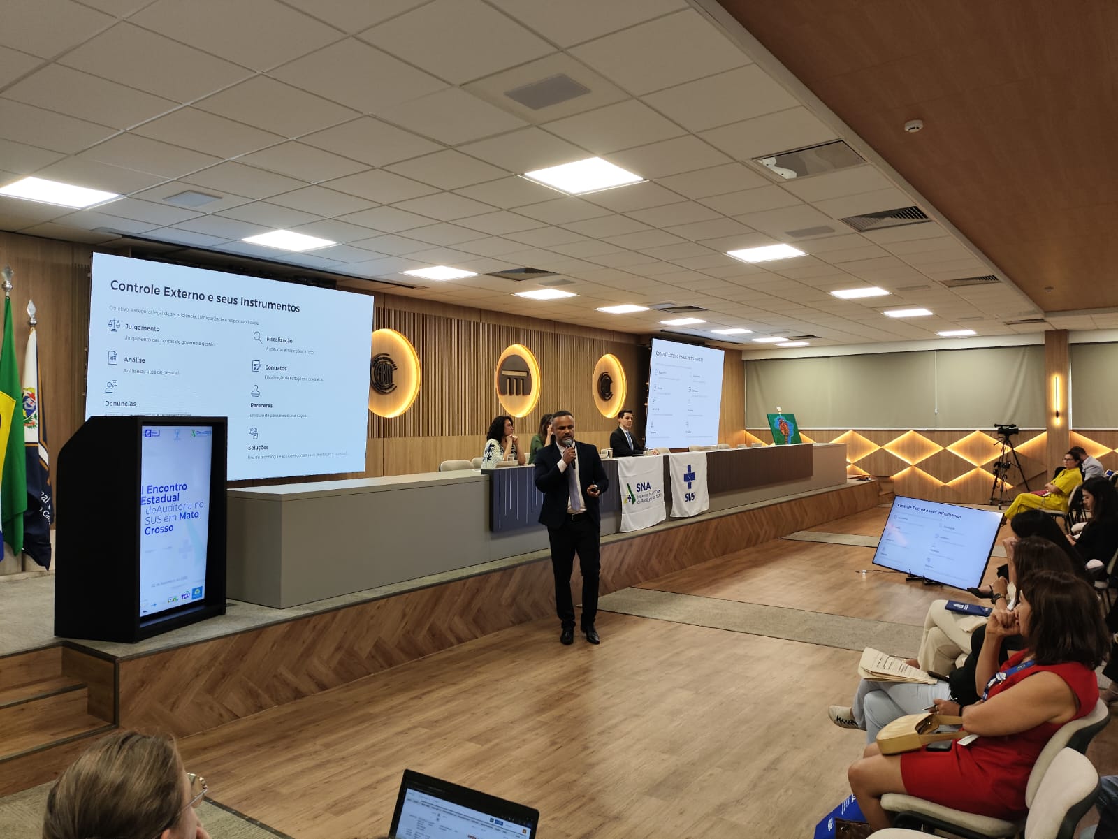 O seminário foi realizado em parceria com a Escola de Saúde Pública de Mato Grosso, o Departamento Nacional de Auditoria do SUS (DENASUS), o Tribunal de Contas do Estado (TCE-MT), o Tribunal de Contas da União (TCU), a Gerência de Auditoria do SUS de Mato Grosso (AGESUS) e o Conselho de Secretarias Municipais de Saúde (COSEMS-MT).