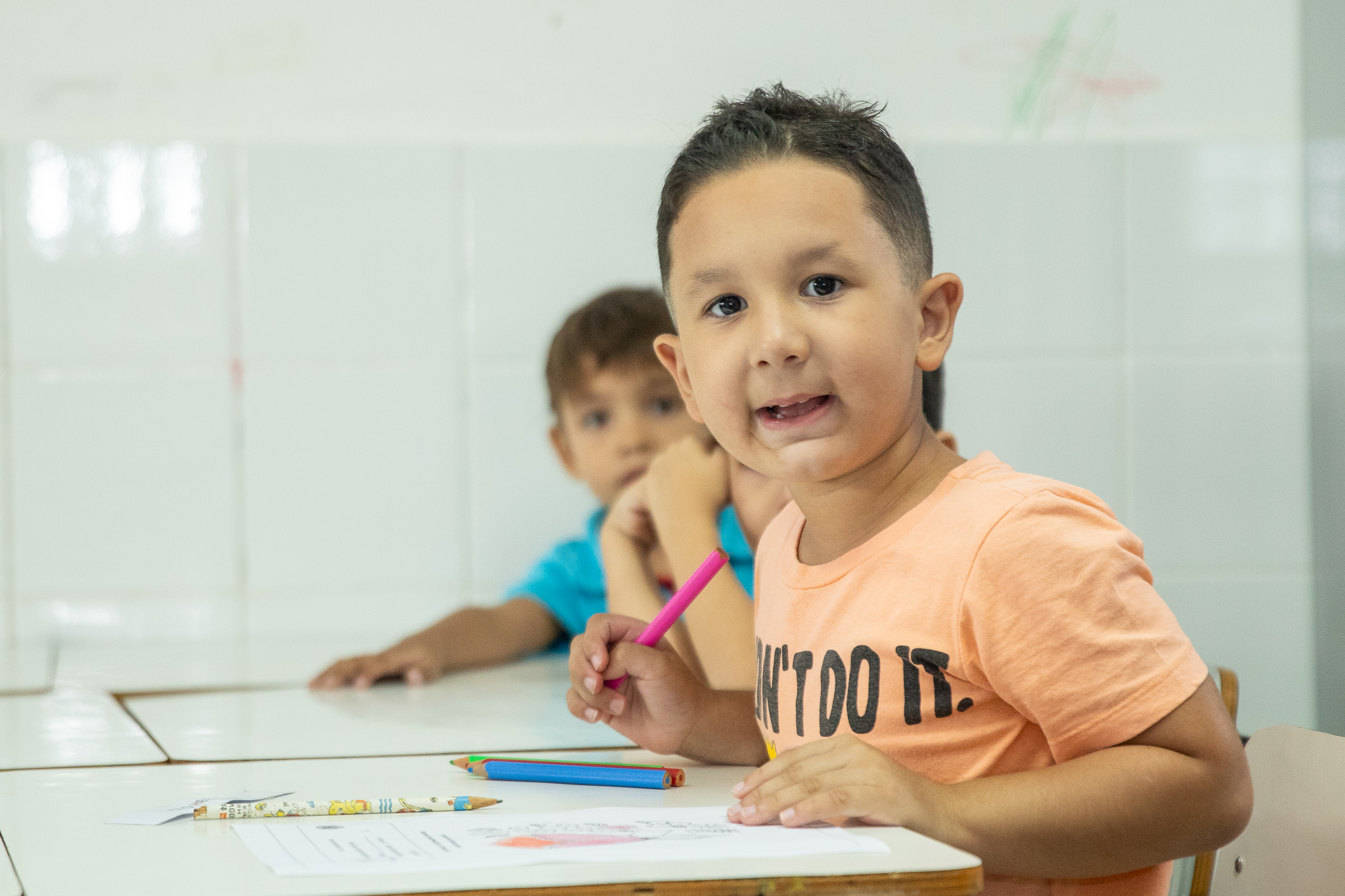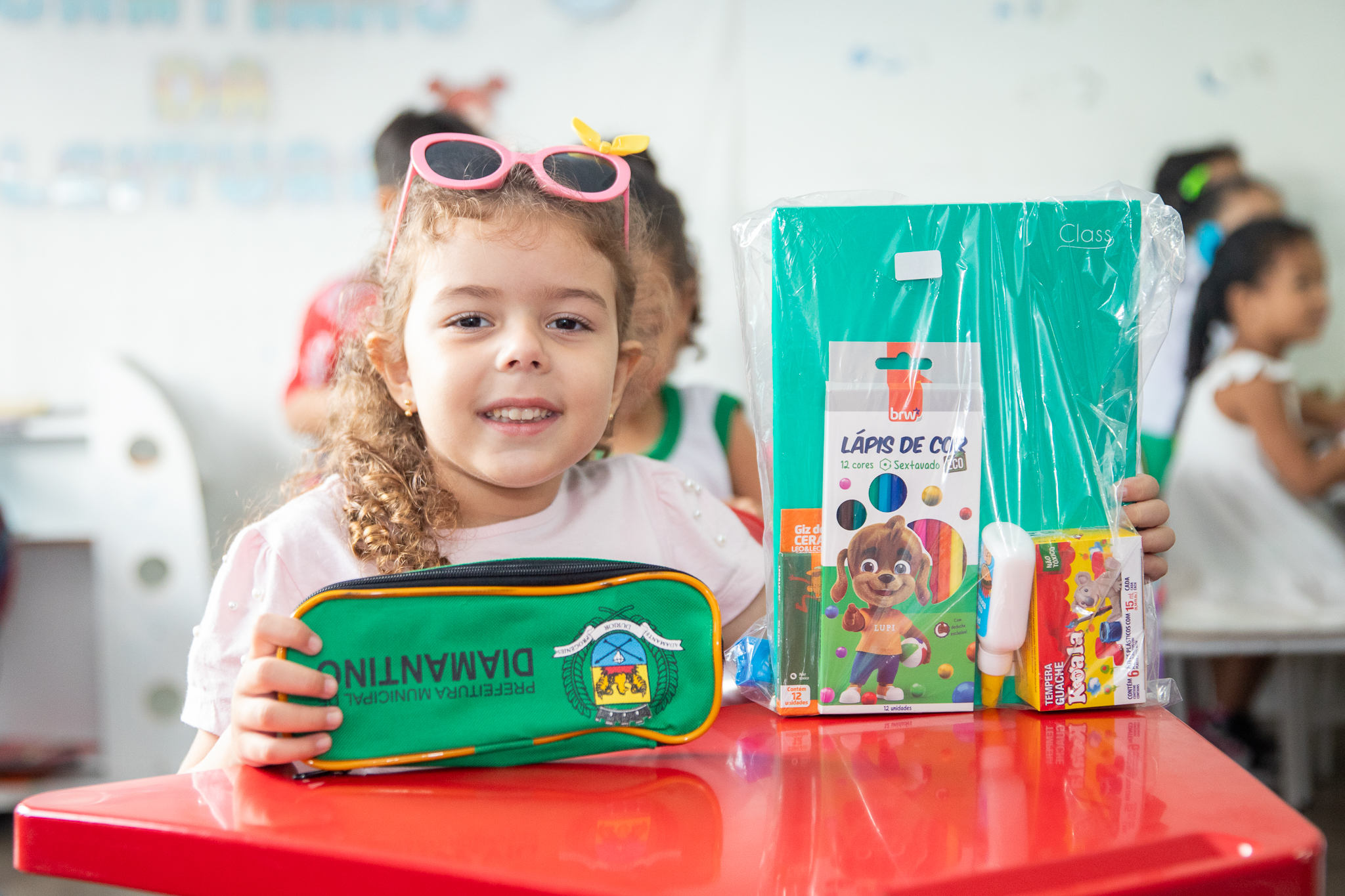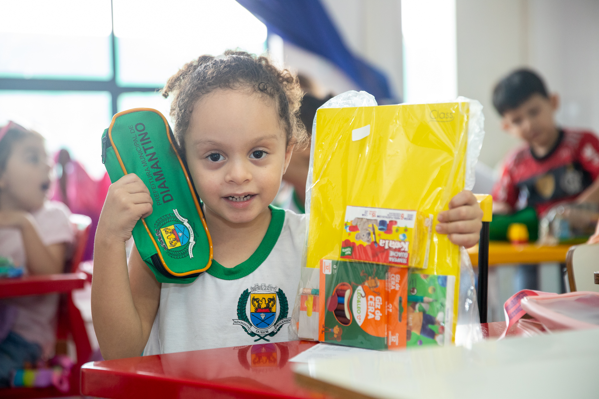 Cada estudante recebeu um kit contendo um caderno, lápis de cor, cola, giz de cera, estojo, entre outros itens que possibilitarão o melhor desenvolvimento e aprendizado.