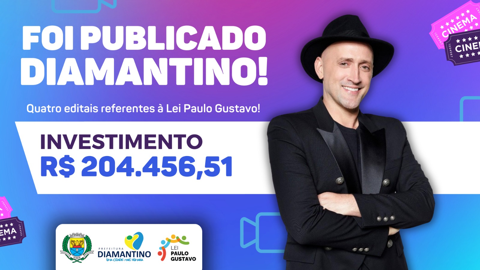 A Prefeitura de Diamantino, por meio da Secretaria Municipal de Cultura e Turismo, lançou nesta sexta-feira (1º.12) quatro editais referentes à Lei Paulo Gustavo. Um edital é voltado para projetos culturais de Audiovisual e os outros três às demais áreas culturais.