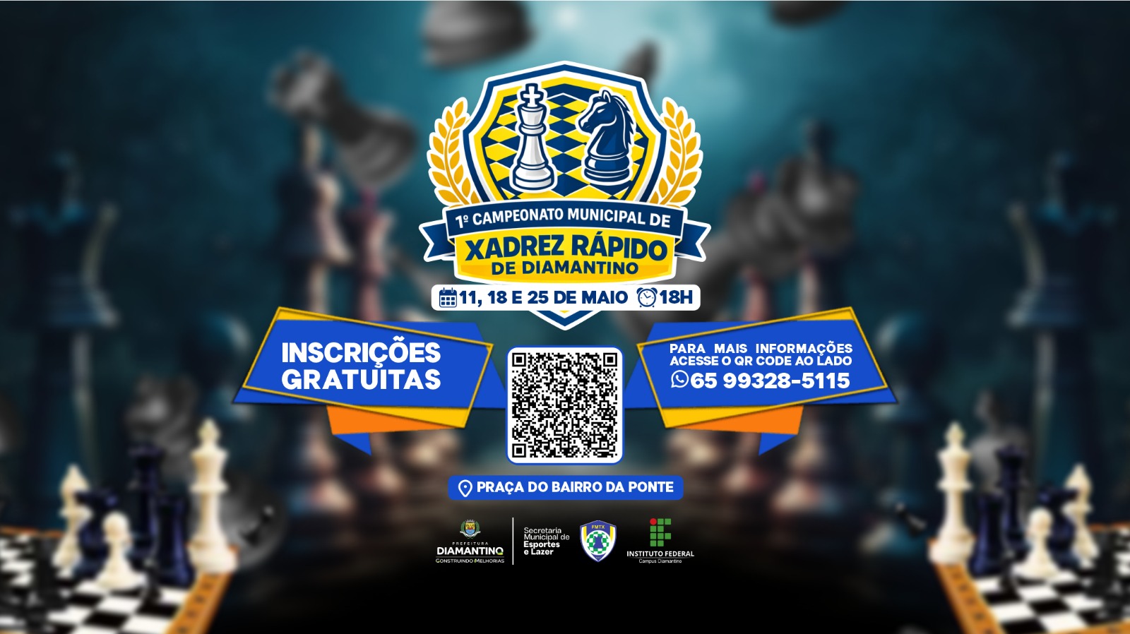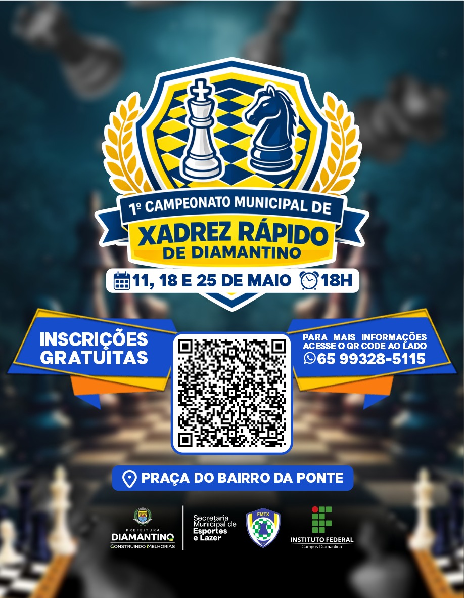 A Prefeitura Municipal de Diamantino, por meio da Secretaria Municipal de Esportes e Lazer, em parceria com o Instituto Federal de Mato Grosso – Campus Diamantino e a Federação Mato-Grossense de Xadrez, realiza, entre os dias 11, 18 e 25 de maio, o 1º Campeonato Municipal de Xadrez Rápido de Diamantino. A iniciativa visa incentivar a prática do xadrez, promover a integração entre os participantes e fortalecer o esporte no município.