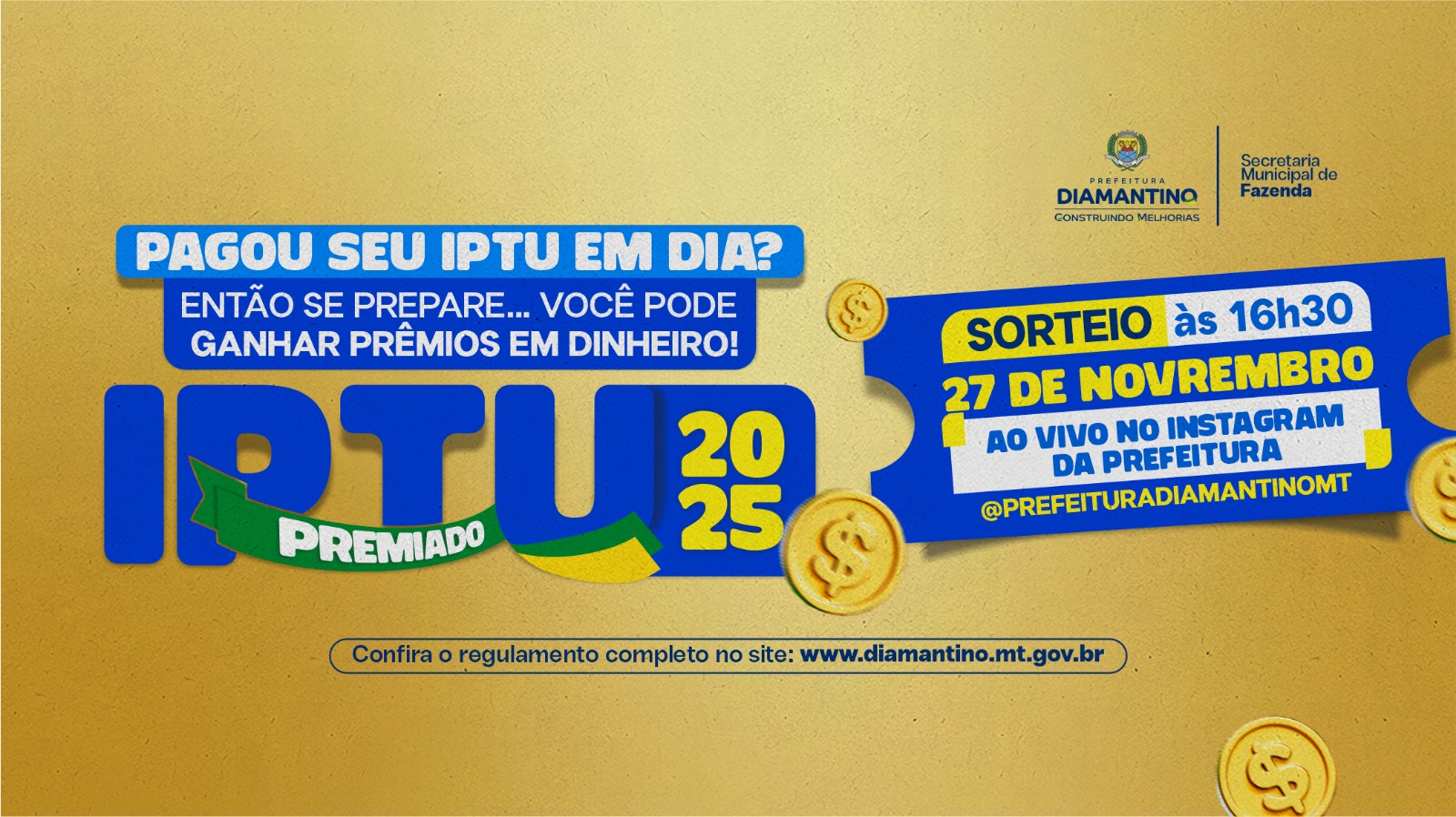 A Prefeitura de Diamantino, por meio da Secretaria Municipal de Fazenda, realiza nesta quinta-feira (27.11), às 16h30, o quinto sorteio do IPTU Premiado 2025. A transmissão será feita ao vivo pelos canais oficiais da Prefeitura de Diamantino, permitindo que toda a população acompanhe o sorteio em tempo real.