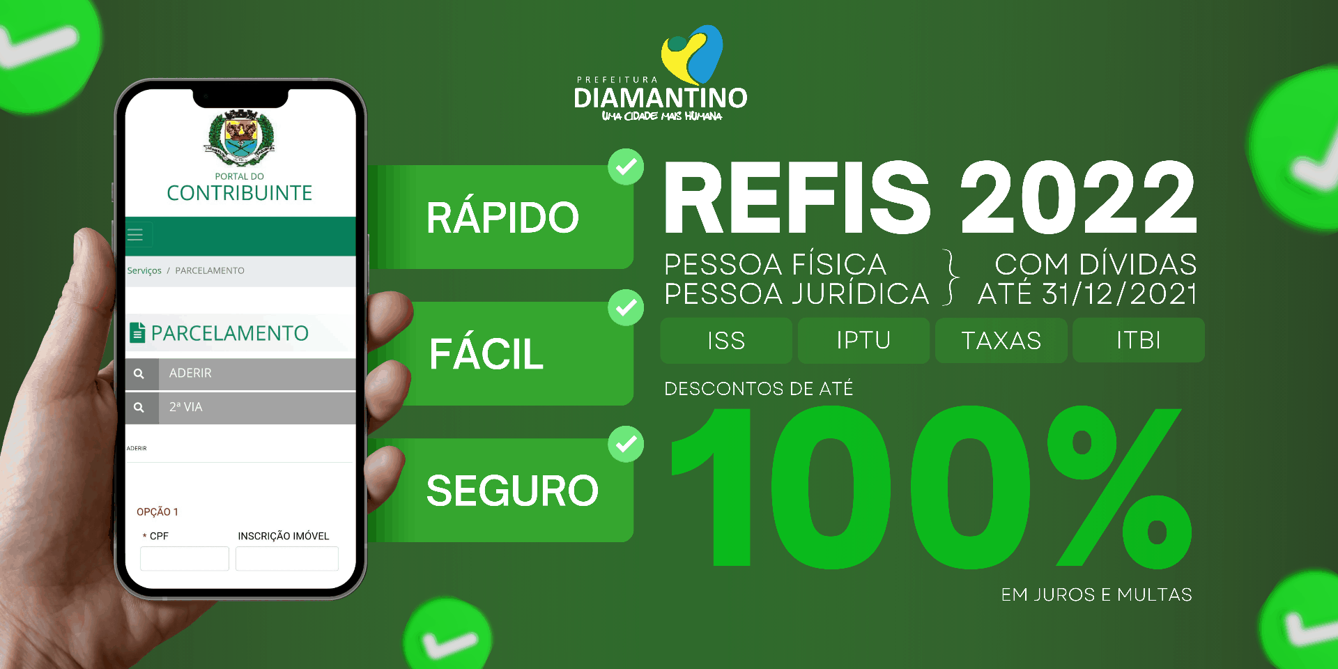 A adesão pode ser efetuada pelo Portal do Contribuinte, disponível no site oficial clicando aqui, presencialmente no Setor de Tributos da Prefeitura de Diamantino ou através do telefone (65) 9. 9224-1432.