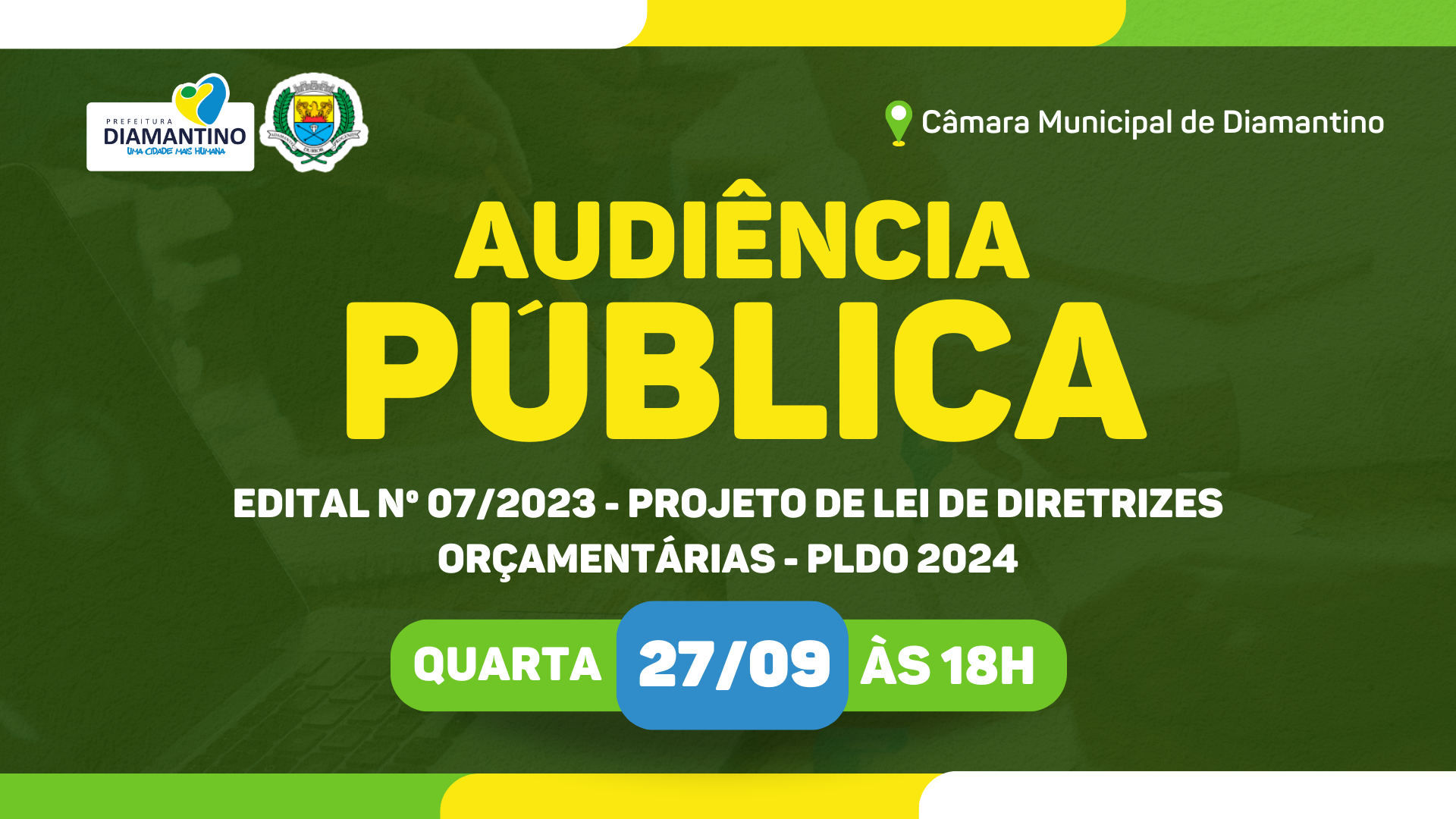 A Prefeitura de Diamantino, por meio da Secretaria Municipal de Fazenda, promove nesta quarta-feira (27.09), às 18 horas, a Audiência Pública para Elaboração e Discussão do Projeto de Lei de Diretrizes Orçamentárias para 2024.