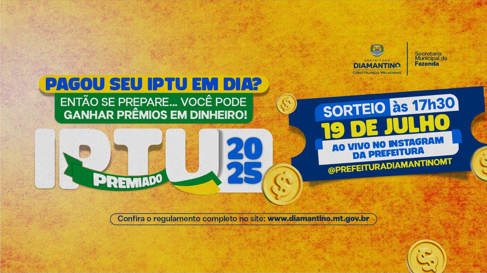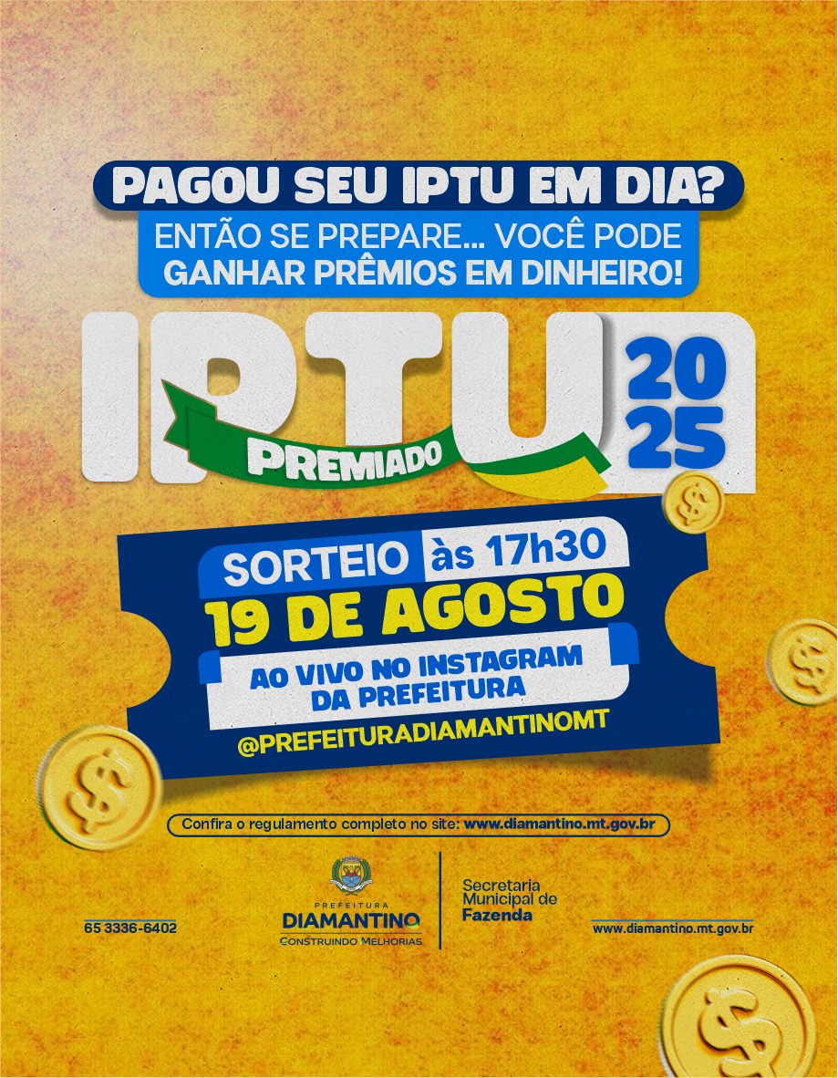 A Prefeitura de Diamantino, por meio da Secretaria Municipal de Fazenda, convida a população para acompanhar o segundo sorteio da campanha IPTU Premiado 2025, que será realizado no dia 19 de agosto (terça-feira), às 17h30, através do Instagram oficial da Prefeitura de Diamantino.