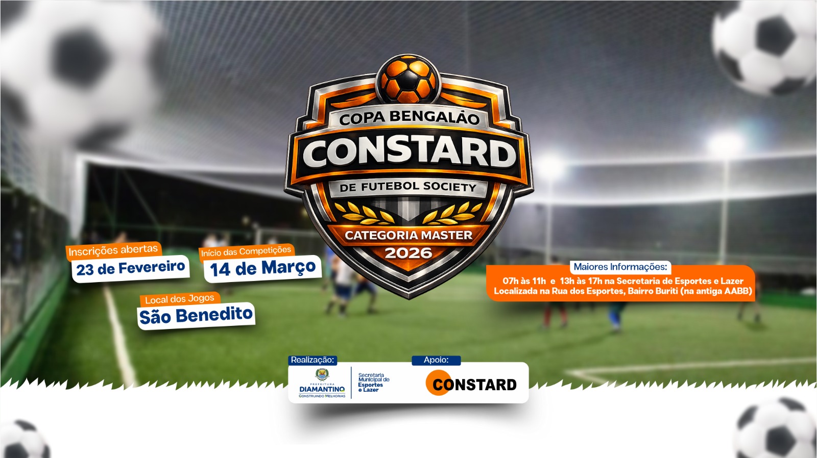 A Prefeitura de Diamantino, por meio da Secretaria Municipal de Esportes e Lazer, com apoio da Constard - Materiais de Construção, realiza mais uma edição da tradicional Copa Bengalão Constard de Futebol Society. As inscrições terão início na segunda-feira (23.02), na sede da Secretaria Municipal de Esportes e Lazer.